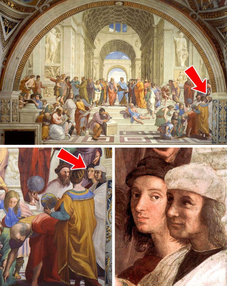 На фресці Рафаеля «Афінська школа» зафіксовано величезну кількість впізнаваних осіб. На ній можна знайти Піфагора, Алківіада, Епікура, Сократа, Діогена і самого Леонардо да Вінчі — всього понад 50 осіб.