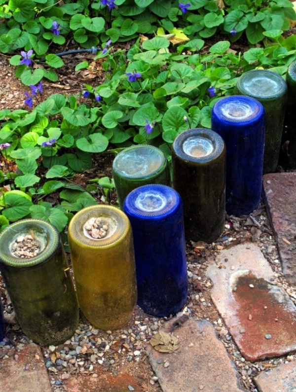 Перевернуті пляшки з-під вина — відмінний спосіб обгородити рослини і прикрасити город.