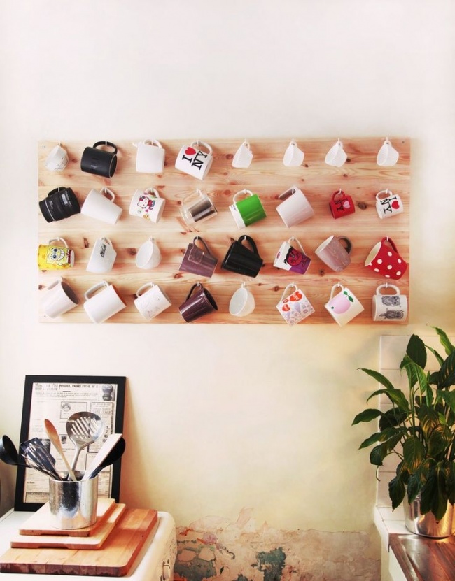 Якщо у вас зібралася купа гарних чашок, немає потреби ховати їх в комод — нехай радують око. До того ж так зручно і брати, і сушити. Ми взяли цю ідею , ось тут.