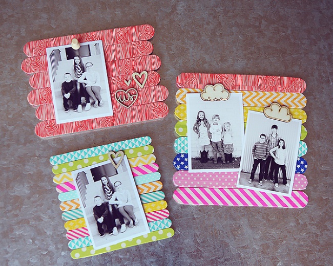 Веселі рамочки для фото можна зробити з розфарбованих паличок для морозива. Цей і інший способи дивіться тут.