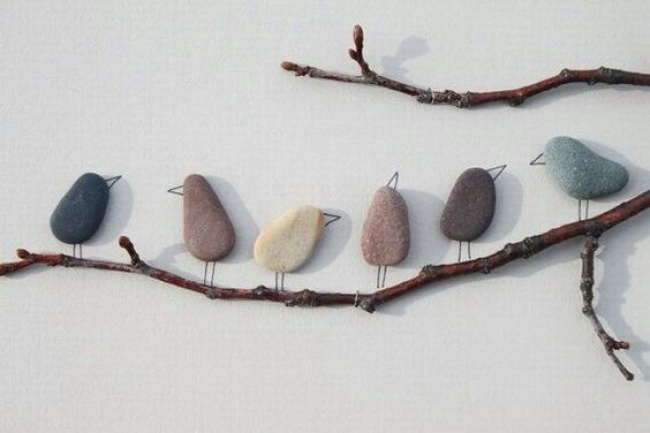 Для панно в екостилі візьміть гальку і приклейте її на картон або дерево. За допомогою чорної ручки домалюйте що хочете.