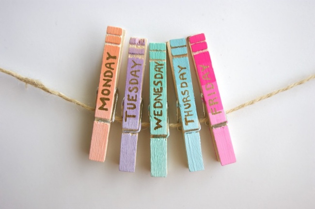 Розвісьте прищіпки на мотузочці на видному місці, напишіть на них дні тижня і прикріпіть картки із запланованими справами.