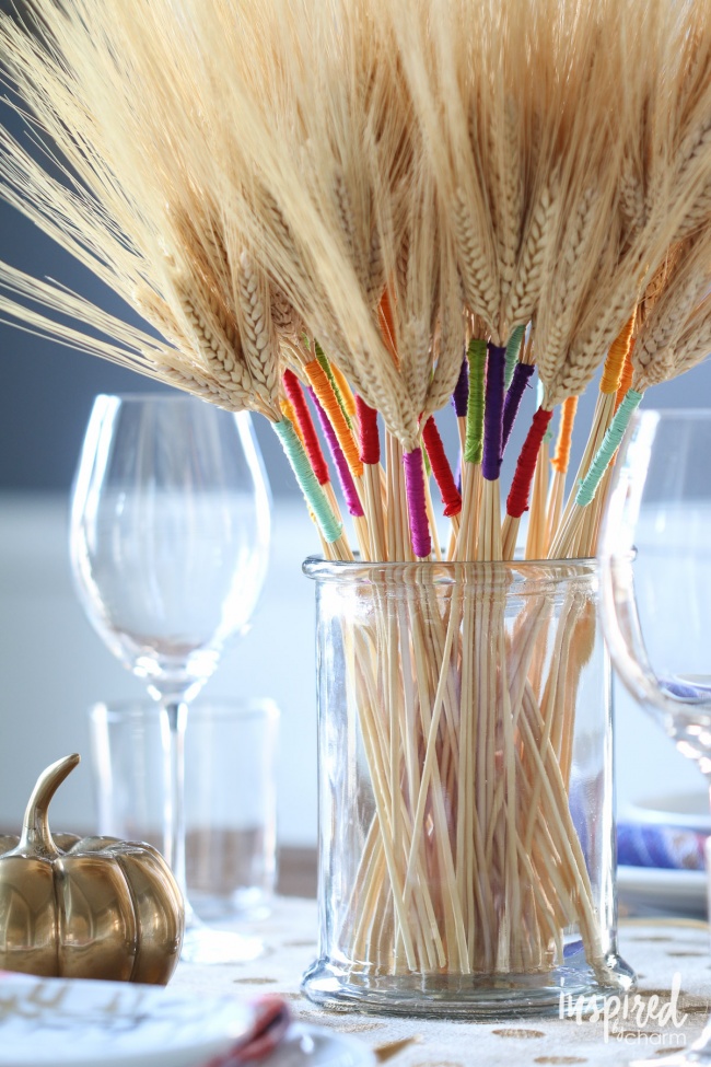 Подивіться, яким відмінним доповненням для букету із сухої пшениці можуть бути кольорові нитки. На відміну від свіжозрізаних квітів, ці колоски будуть радувати око дуже довго. Спасибі цього сайту за ідею.