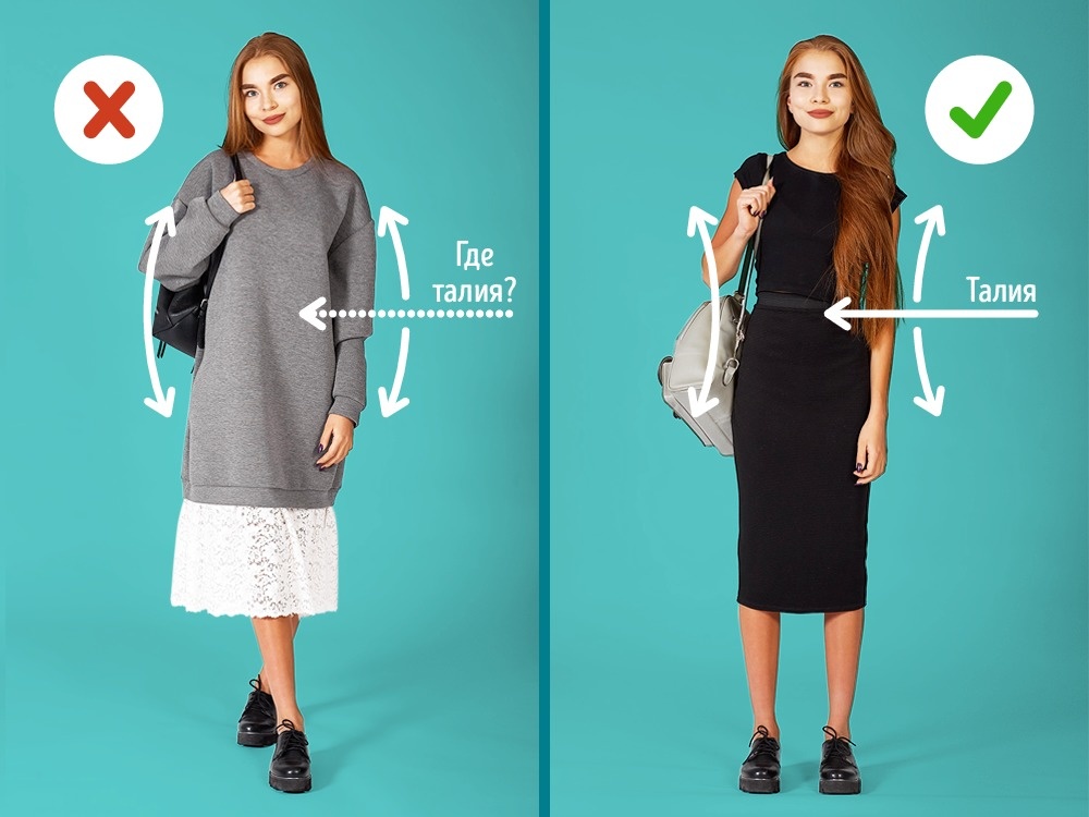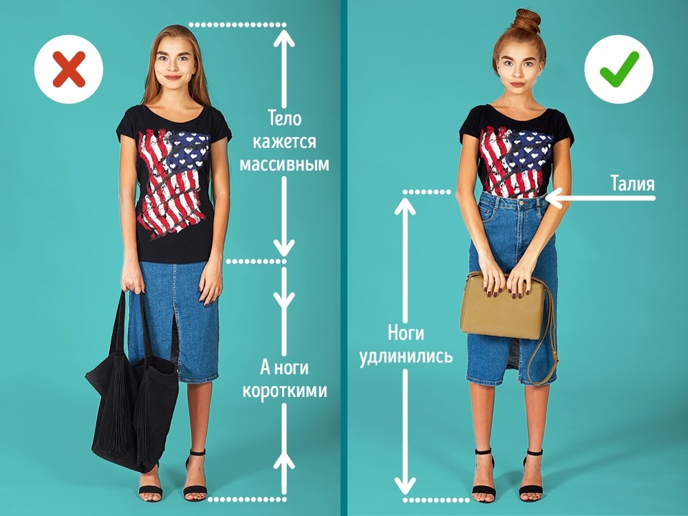 Щоб відмінно виглядати, важливо не забувати про пропорції фігури, які можна задати за допомогою одягу. Випущений назовні топ «розріже» фігуру навпіл, зробить тулуб більш масивним і довгим, а ноги — вкоротить. Топ краще заправити в спідницю — так ми акцентуємо талію, удлиним ноги і в цілому зробимо фігуру більш витонченою і стрункою. Ще варіант — укорочений топ зі спідницею.
