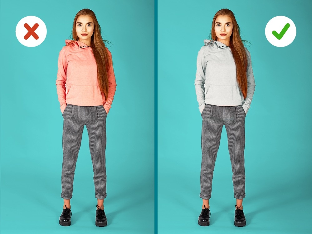 Контрастні кольори в одязі, наприклад яскравий верх і темний низ, будуть розбивати фігуру на частини і створювати виражену горизонтальну лінію кордону, тим самим підкреслюючи маленький зріст. Монохромні ж комплекти візуально подовжують силует. Крім того, зверніть увагу, що одяг яскравих кольорів виглядає об'ємніше: той же самий світшот, тільки іншого кольору (ліворуч), здається трохи більше.