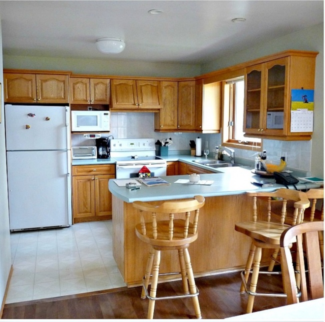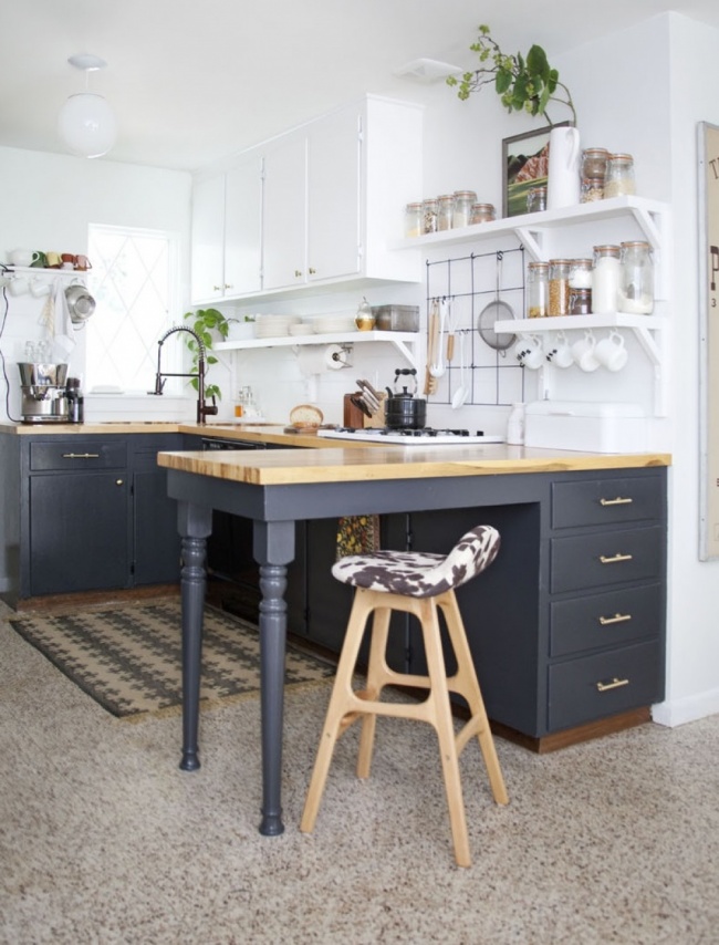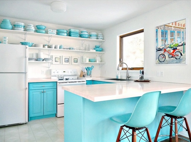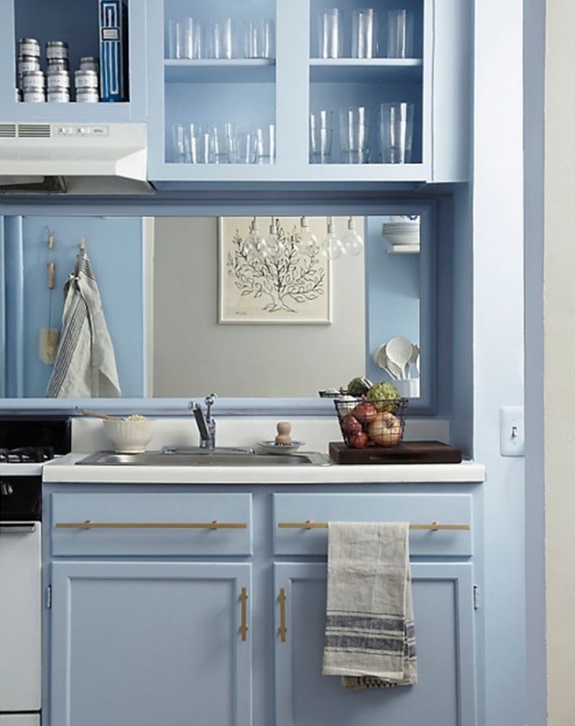 Заміна верхнього ряду шаф на відкриті полиці та фарбування меблів і стін в "морський" гамі вимагають мінімум витрат, однак повністю змінюють нудний і безликий інтер'єр.