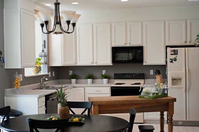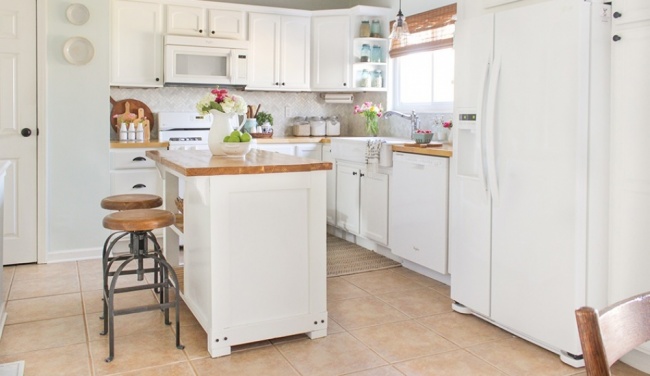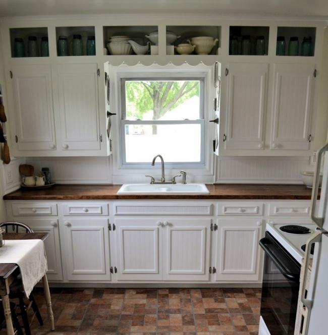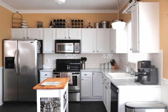 Фасади, оновлені за допомогою білої фарби, і такого ж кольору фартух не тільки роблять кухню світліше, але і візуально розширюють простір.