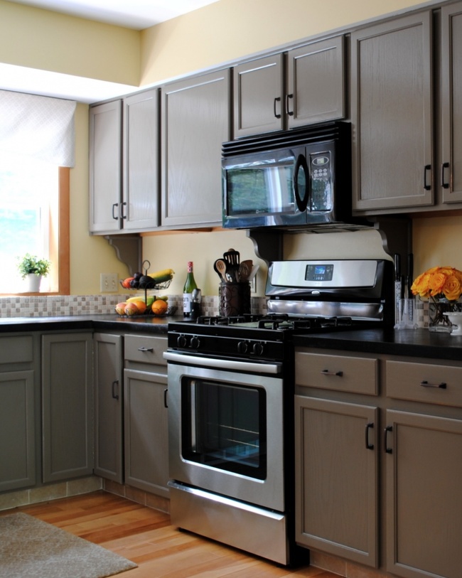 Сіра фарба, якою були пофарбовані фасади кухні, перетворила звичайний «сільський» стіна в сучасну стильну меблі.