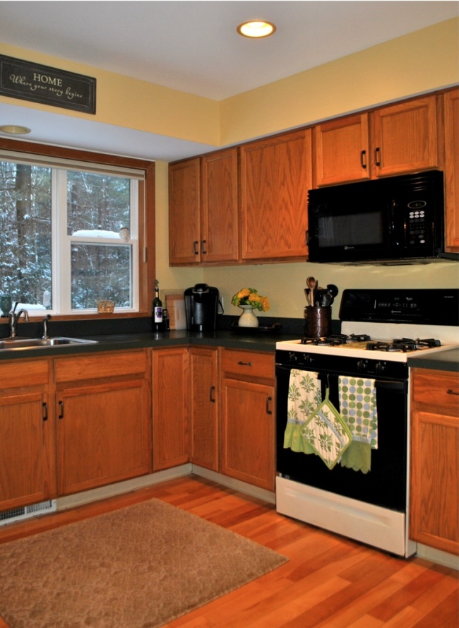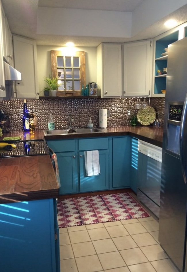 Якщо уважно придивитися до фотографій «до» і «після», то стає ясно, що шафи на цій кухні залишилися тими ж. Відчуття абсолютно нового простору досягнуто багато в чому завдяки фарбуванню фасадів та стін в контрастні кольори і додавання яскравих аксесуарів.