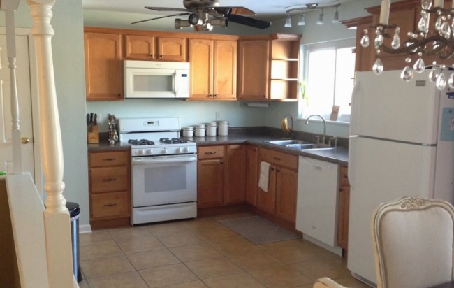 Все та ж біла фарба замість помаранчевої, молдинги на фасадах і відкриті вітрини нагорі замість закритих полиць перетворюють старомодну кухню в сучасний простір.
