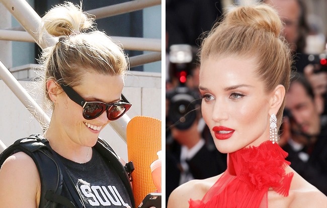 Різ Візерспун займається з такою зачіскою в тренажерному залі, а елегантна Роузі Хантінгтон—Уайтлі з високим пучком обожнює виходити в світ. Універсальність цієї укладання дозволяє вам зробити швидкий «вуличний» варіант або гладко зачесати волосся для урочистого випадку.