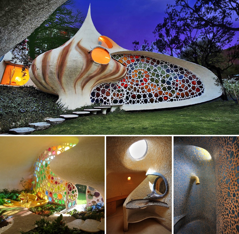 Втілення органічної архітектури в поєднанні з естетикою біотек. Промені світла, що проникають через різнокольорові скла, наповнюють будинок яскравими відблисками. Шорсткі на дотик міцні стіни легко встоять при землетрусі, стелиться по підлозі живий рослинний килим, а стежки з каменю ведуть до житлових кімнат.