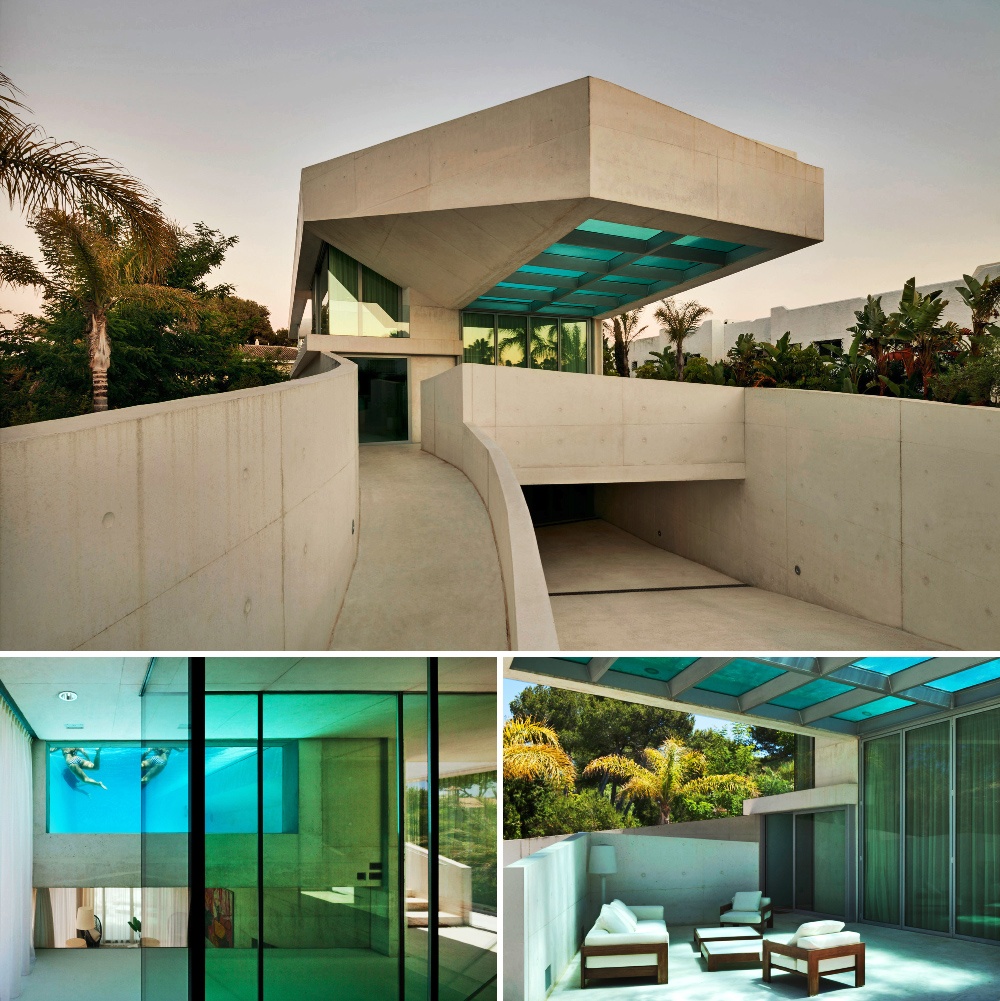 Сусідні будівлі закривали собою вид на море, тому величезний басейн перетворився на дах цього чудового особняка. Хвилі створюють химерні відблиски у вітальні, а блакитний світло заливає всі кімнати завдяки панорамним вікнам.