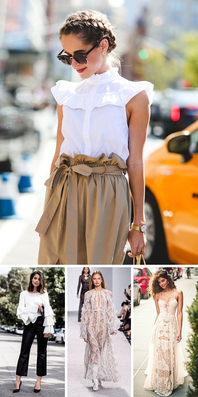 Жіночність і елегантність знову повертаються в моду в цьому році. Ну а що може бути більш жіночним, ніж напівпрозорі мереживні сукні, повітряні рюші і грайливі оборки? Не бійтеся додати своєму образу трохи легковажності, зробивши ставку на цей модний тренд.