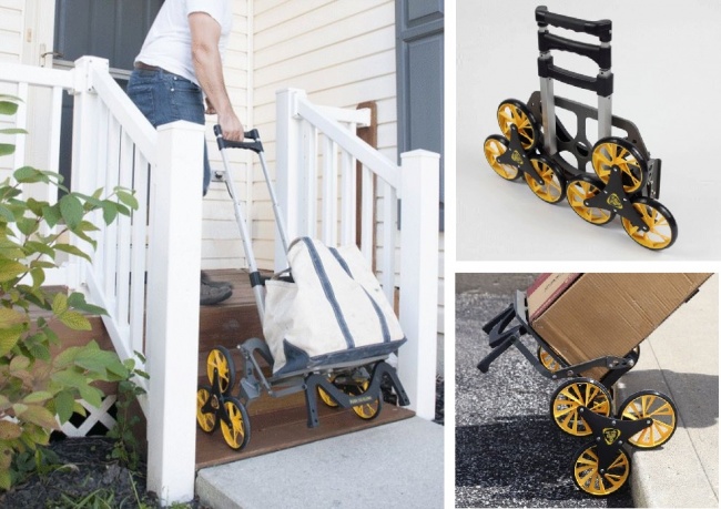 Американські дизайнери створили складну візок, оснащену системою строенных коліс, які повертаються на трикутному ободі, забезпечуючи плавний підйом на сходинки висотою до 23 см і шириною від 14 див. Тепер підняти важкі сумки на 9-й поверх не буде представляти вам складності.