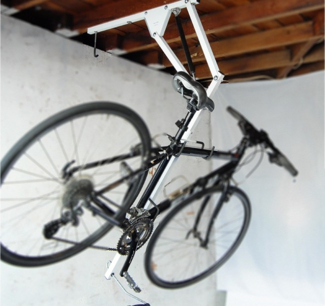 Дійсно геніальний винахід — розкладна система для зберігання велосипеда під стелею Hide-A-Ride. Нескладна конструкція дозволяє закріпити виріб на стелі в будь-якому приміщенні, будь то балкон, вузький коридор або кімната. З такою системою ваш велосипед не займе півкімнати, а буде акуратно висіли під стелею.