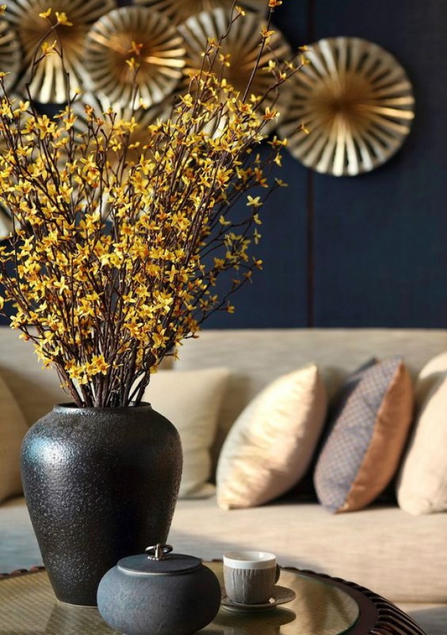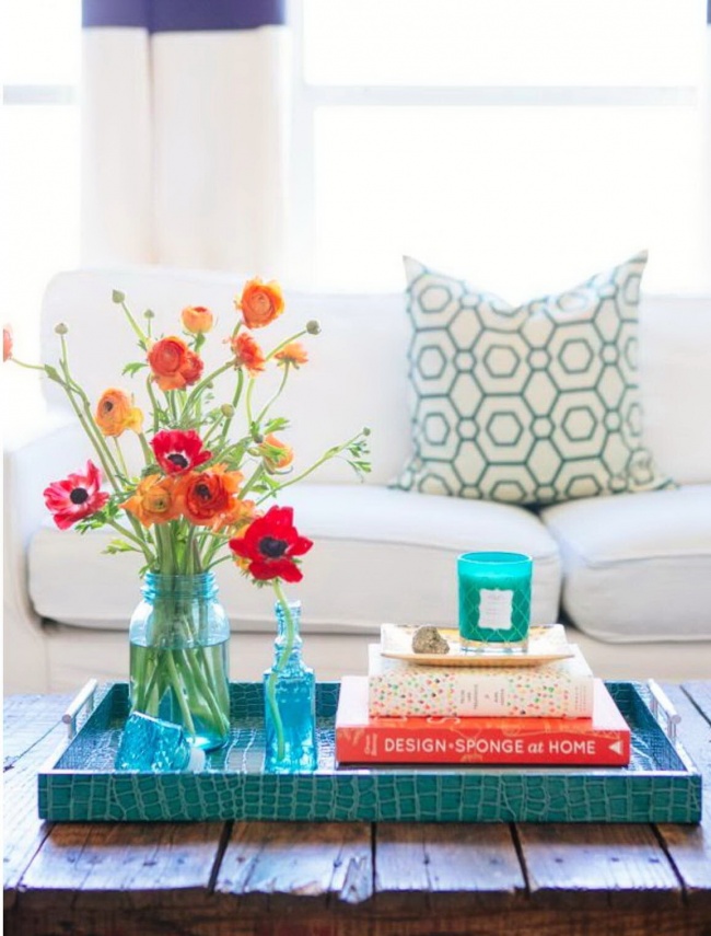Квіти краще розташовувати в різних куточках будинку (на столиках, підвіконнях, тумбочках), а не групувати в центрі. Коли вам дарують великі букети без композиції, можна розділити їх на маленькі. А найкращий варіант — садові або польові квіти. Довільне розміщення дозволяє створити відчуття, що квіти у вашому будинку є завжди, а не тільки у свята.
