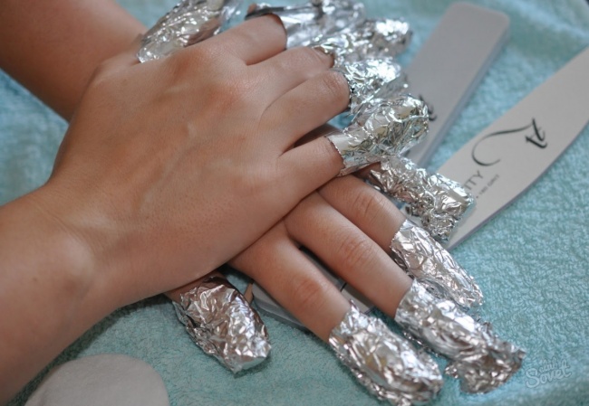 - Для швидкого видалення дрібних блискіток з нігтів потрібно нанести рідина для зняття лаку на ватний тампон, прикласти його до нігтя і загорнути у фольгу. Через кілька хвилин блискітки повністю зникнуть.