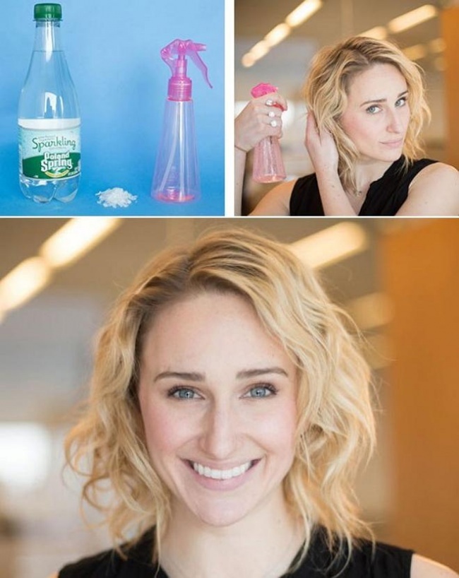 - Щоб зберегти кучерики після завивки протягом всього дня, використовуйте морську воду. 1 ч. л. морської солі розмішати в 0,5 л мінеральної води і залити в баночку з розпилювачем — сіль закріпить кучері.