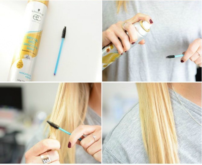 - Від вибиваються волосків можна позбутися наступним чином: збризніть волосся лаком для волосся, а зверху пригладьте неслухняні волоски щіточкою для туші.