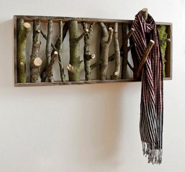 Спіли сухих гілок можна використовувати як вішалку, помістивши їх у звичайну раму з дощок. Недорого і практично — як це зробити, дивіться тут.