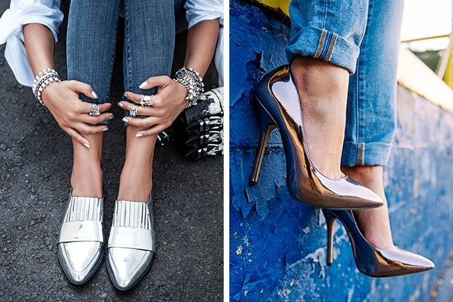 «Металева» взуття! Вірите чи ні, але металеві кольори поєднуються абсолютно зі всім. Ми звикли використовувати метал тільки в сережках та ланцюжках. І дуже даремно! Повністю металеві черевики здатні ідеально завершити будь-який образ.