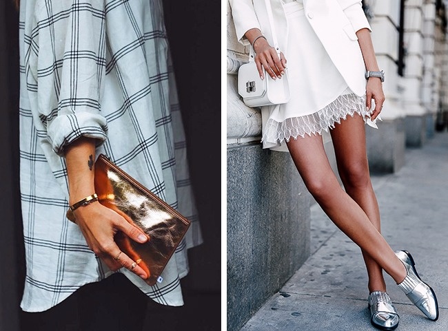 З аксесуарів металевий колір «перестрибнув» на одяг. Подібні наряди можуть здатися вам кілька ризикованими, але, повірте, в поєднанні з нейтральними кольорами вони роблять образ яскравим і неповторним.