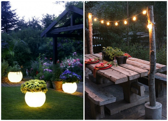 Підсвічені квіткові горщики у вечірньому саду виглядають чудово. А ще можна зробити гірлянду з лампочок.