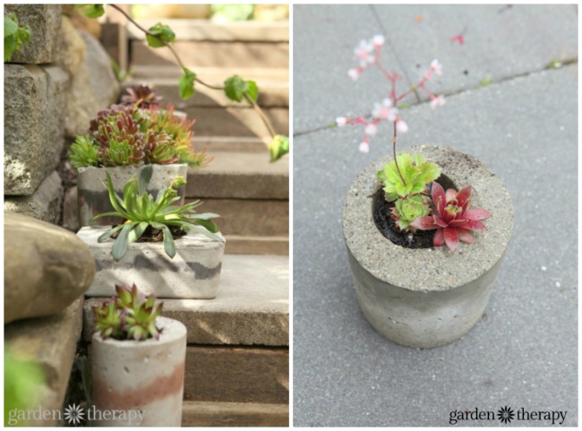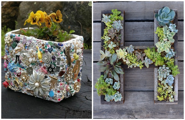 Незвичайну клумбу можна зробити з чого завгодно. Наприклад, декорувати бетон непотрібними прикрасами або посадити сукуленти і повісити всю конструкцію на стіну.