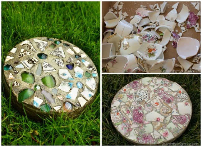 Плитки для доріжки або просто оригінальний садовий декор з битого скла і черепків. Ось тут і тут є покрокові інструкції.