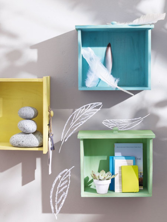 Додайте своїх улюблених фарб — і ви просто очей не зможете відірвати від цих милих шухлядок, прибитих до стіни вашої кімнати. Правило «чим менше, тим краще» в цьому випадку працює безвідмовно. Пора робити!