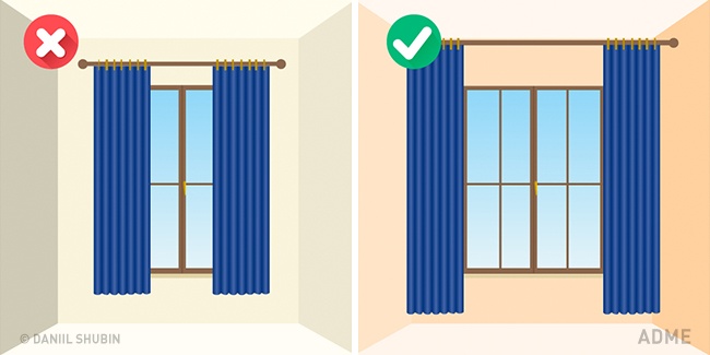 Якщо повісити штори не над самими вікнами, а ближче до стелі, вікна будуть здаватися більше, ніж є насправді.