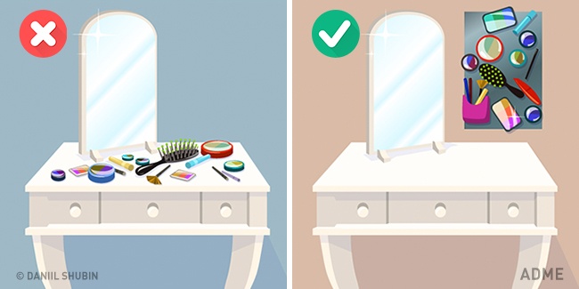 У кожної дівчини серед усього різноманіття косметики є певні предмети, якими вона користується найчастіше. Щоб ці штучки не бовталися без справи на столику або не запихивались в полку на швидку руку, можна прикріпити до стіни магнітну дошку.
