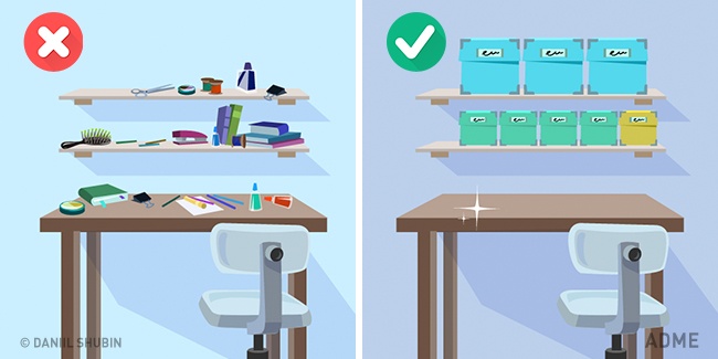 Щоб все лежало на своїх місцях, потрібно ці місця створити. Наприклад, розставити іменні коробочки, в кожній з яких будуть лежати якісь конкретні предмети: гребінці, канцелярія, косметика, блокноти і т. д.