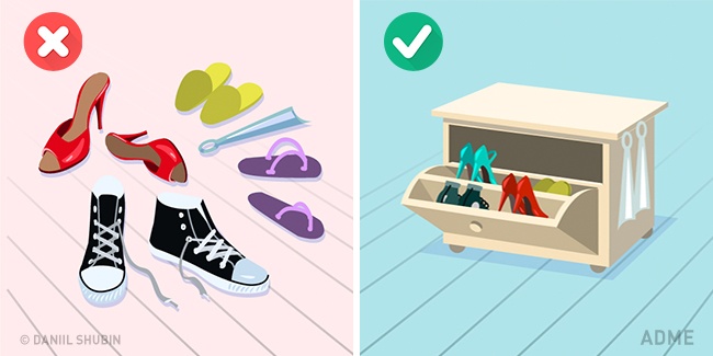 Експерти радять нам докласти зусиль і придумати який-небудь хитрий спосіб витончено зберігати всі чоботи, ботильйони, кросівки, туфлі і т. д. найпростіший — це спеціально призначені шафки. Як результат, місця стане більше, а житло — набагато красивіше.