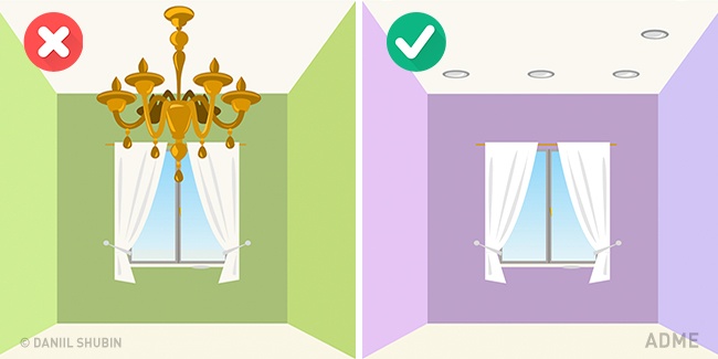 В кімнаті скромних розмірів габаритна люстра недоречна, так як вона «з'їдає» багато простору. Використовуйте по всьому периметру точковий світло — він візуально розширить габарити житлової площі.