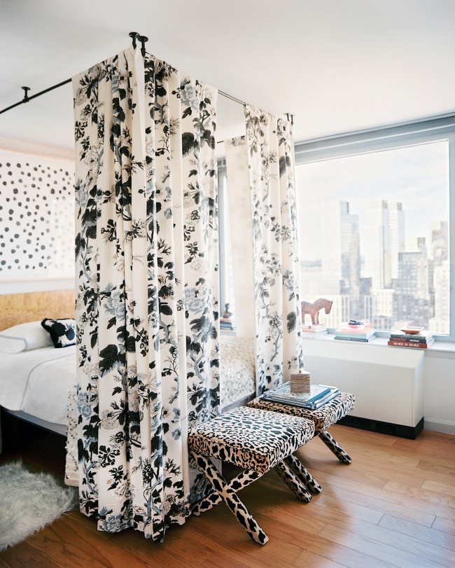 Якщо повісити карниз для штори над ліжком, то кімната не здається банальною.