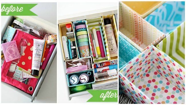 Щоб речі в ящику столу не валялися однією великою купою, можна легко зробити роздільник з картонних упаковок. Покроковий майстер-клас дивимося тут.