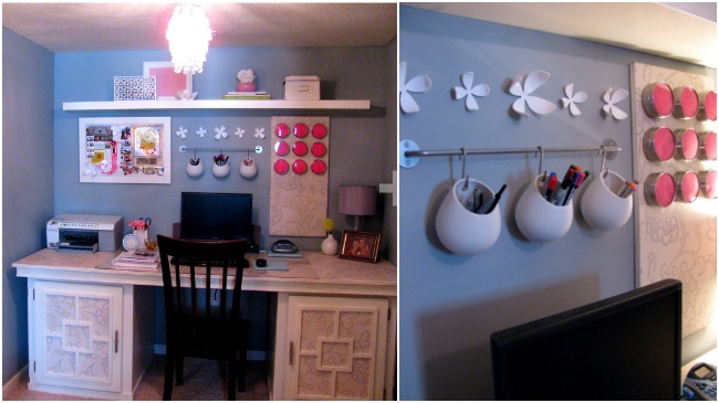 Щоб звільнити робочий простір на столі, деякі предмети можна підвісити. Як оригінально застосувати цей підхід у справі, написано тут.