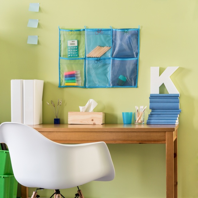 Яскраве рішення для тих, у кого складаються стосунки з ниткою і голкою. Пошивши і повісивши килимок з кишенями над робочим столом, можна вирішити всі проблеми з втраченими дрібницями.