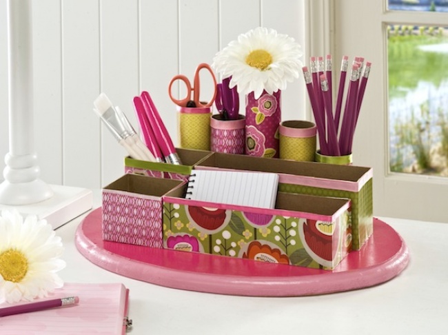 Такий настільний органайзер легко можна зробити з підручних засобів — картонних коробок і рулонів від туалетного паперу. Мінімум витрат і максимум позитивного настрою.