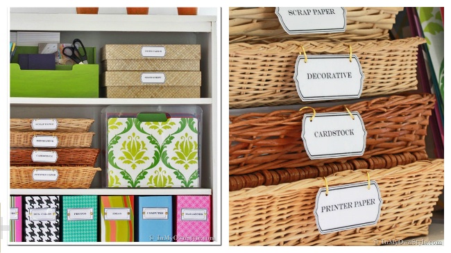 Акуратно розсортувавши всі необхідні речі по папках і коробок, можна сміливо подолати безлад на робочому столі. A позначивши місця зберігання барвистими стікерами або лейблами, як тут, легко знайти потрібну річ.