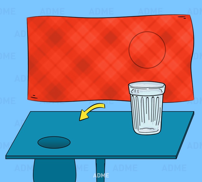 На стіл ставиться склянка з водою, який після накривають хусткою. Потім склянку піднімають і кидають у повітря, підсумок: хустка опускається на підлогу, а склянку зникає. І ось у чому тут фішка: по-перше, в хустку вшивається дротяне кільце, яке створює ілюзію того, що під хусткою знаходиться склянку. А по-друге, сам склянку опускають у таємний мішечок крізь хитру дірку в столі.