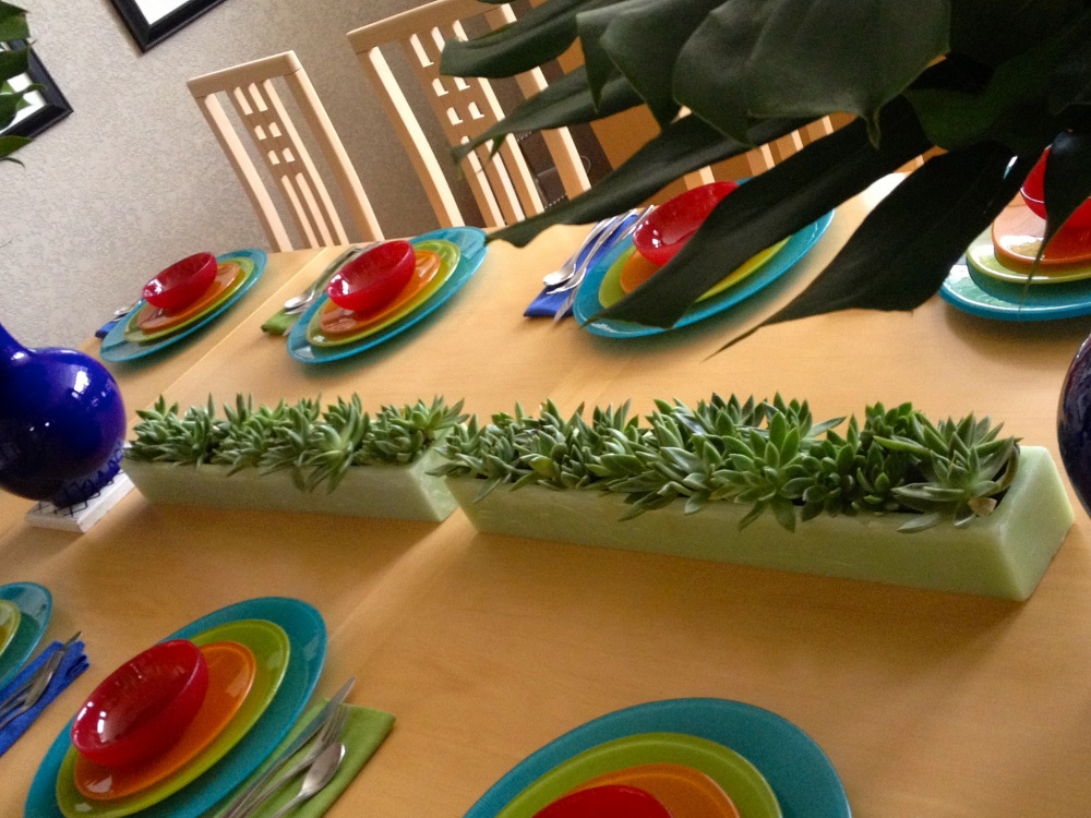 Настільні композиції з сукулентів або невисоких квітів чудово освіжають обідній стіл. Більш яскраві рослини і пишні квіти, розташовані в одну лінію по центру, припадуть до речі для урочистої вечері.