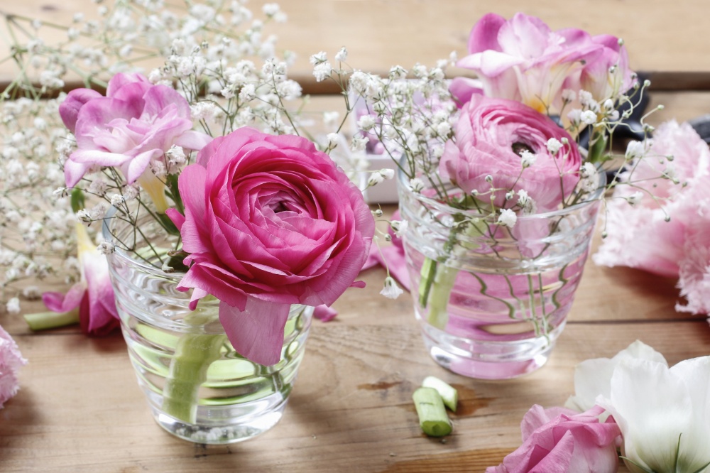 Крихітні букети в крихітних келихах сприяють появі романтичного настрою і повітряних спідниць в гардеробі. При складанні краще не перевантажувати композицію квітами. Один великий квітку і трохи дрібних або зелені будуть найоптимальнішим варіантом.
