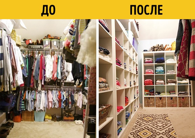 Забита під зав'язку гардеробна стає чистою і охайною за рахунок шаф і додаткових полиць. Інструкція тут.