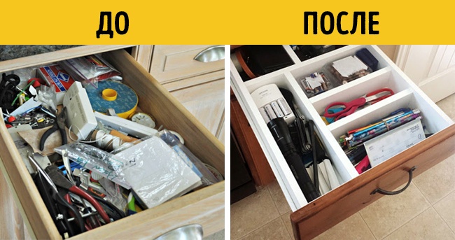 Зробіть такі прості перегородки, і ящик завжди буде виглядати акуратно. Як це зробити, показано тут.