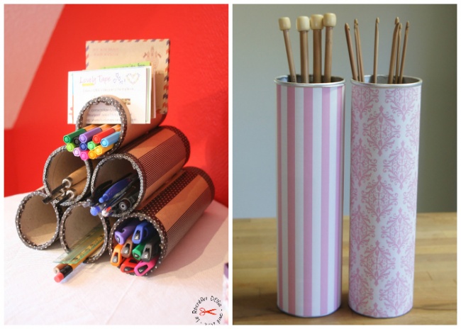 У порожніх тубах дуже зручно зберігати стрічки, тасьму, товсті нитки, шпагати та інші матеріали для творчості. З допомогою невеликих маніпуляцій надійно закріплюємо все всередині і насолоджуємося ідеальним порядком на робочому столі.