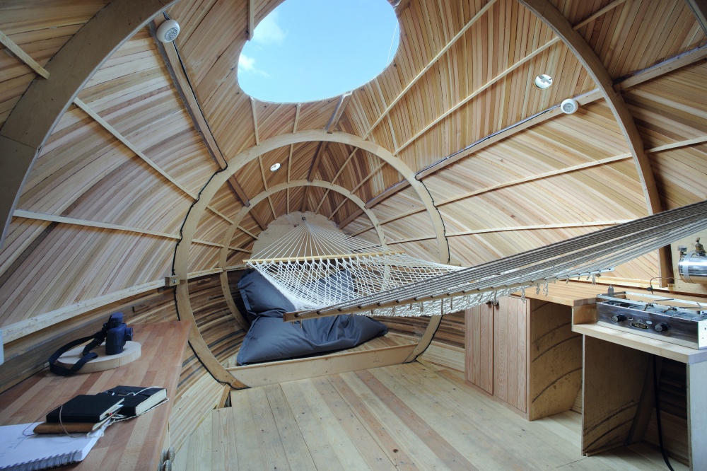 Дизайнери на славу потрудилися над будинком, який створено для того, щоб стояти саме на пагорбі: форма і палі, на яких встановлено будинок, покликані зробити вигляд з вікна справді захоплюючим. Для цього ж величезне вікно. А ось подушки і стилізована піч для комфорту.