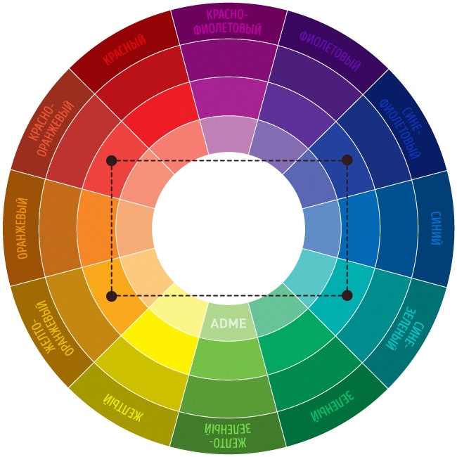 Поєднання 4 кольорів, рівновіддалених один від одного. Кольори тут несхожі за тону, а також комплементарны. За рахунок цього образ буде динамічним, грайливим і яскравим. Приклад: фіолетовий, червоно-оранжевий, жовтий, синьо-зелений.